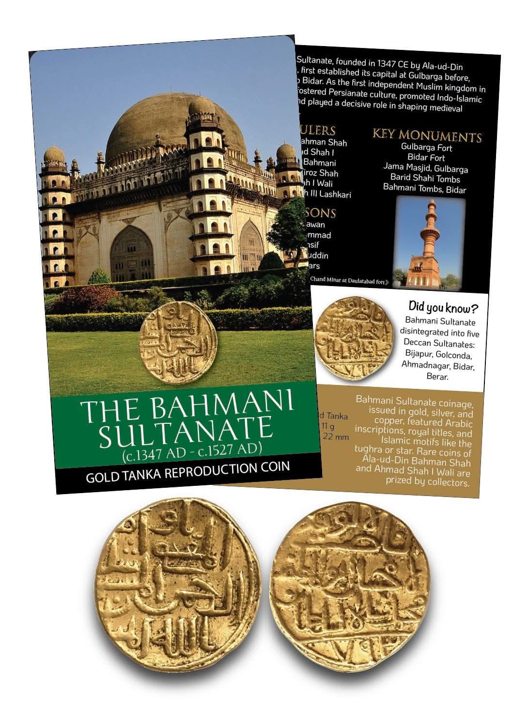Celebrate the grandeur of the Bahmani Sultanate, the first independent Muslim kingdom of the Deccan, known for its powerful rulers, Persianate culture, and magnificent architecture. This reproduction is inspired by the classic Bahmani Gold Tanka, famed for its bold calligraphy and elegant Islamic artistry.