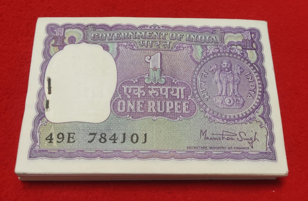 Own this extremely rare one rupee bundle from 1978, signed by Manmohan Singh, A-38. Includes 100 serial-wise notes in gem condition, serial number 784101—a true collector’s treasure.