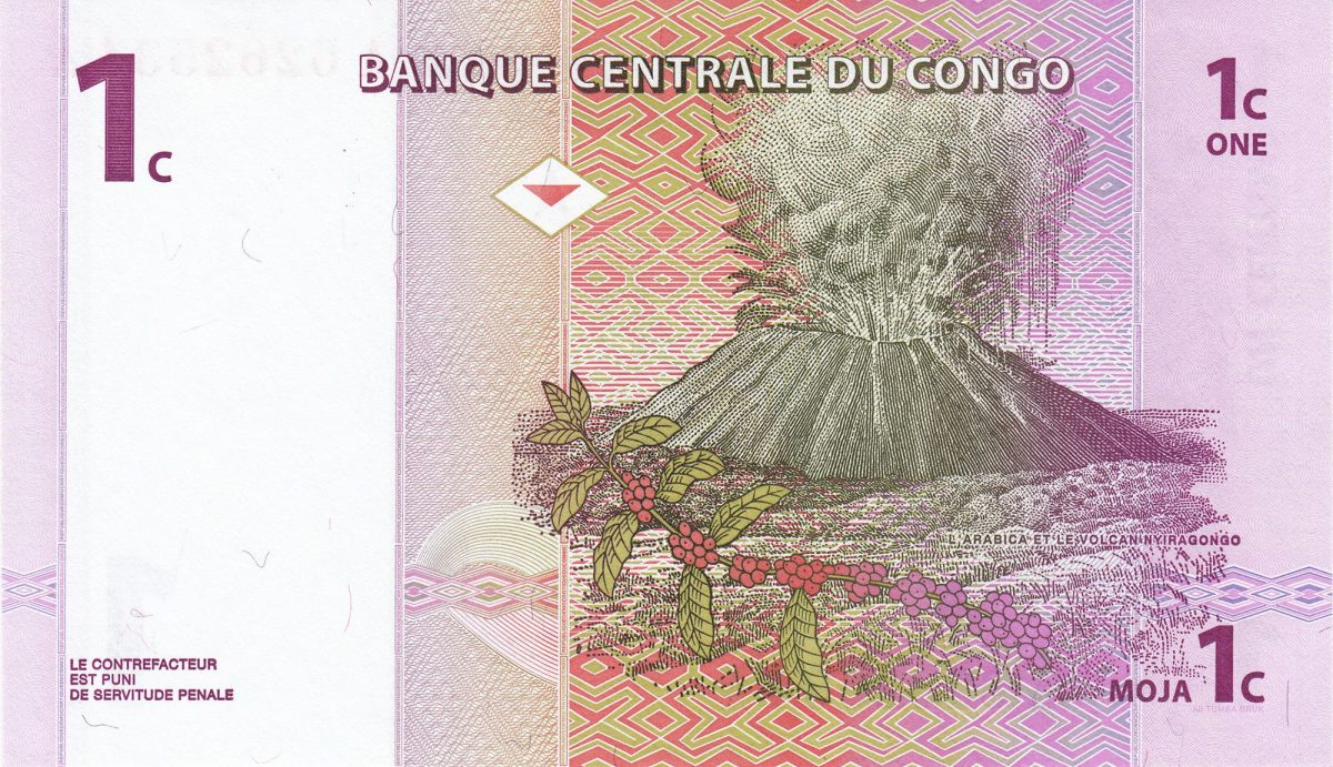 1 Centime of Congo Country (AD 1997) with Woman harvesting coffee beans/Nyiragongo volcano erupting