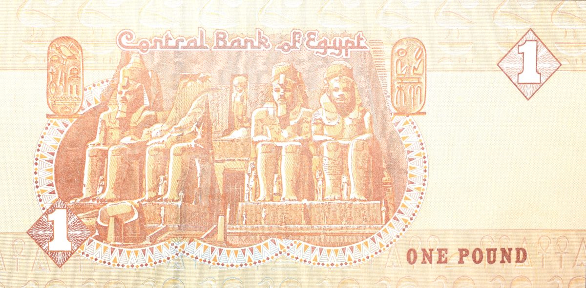 1 Pound of Egypt (AD 2016) with Colossal statues of Ramses II seated at the main entrance to the Great Temple at Abu Simbel, near Aswān, Egypt