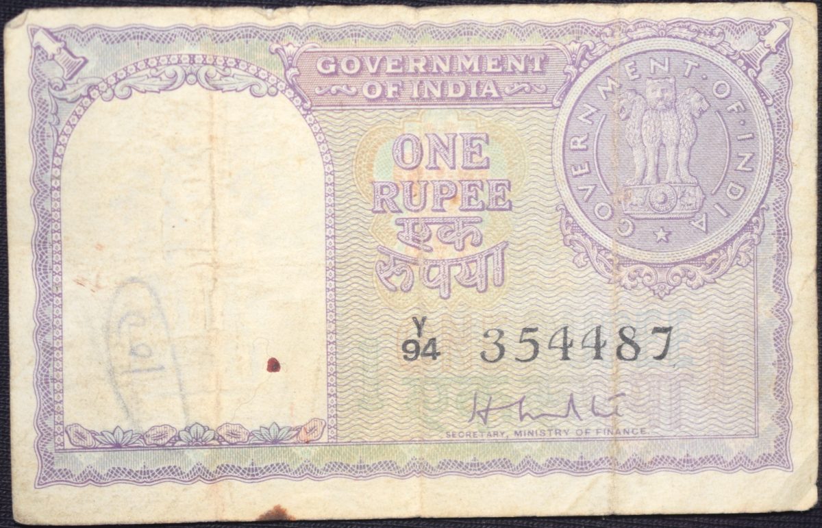 Republic India, (AD 1951), 1 Rupee, H.M. Patel Signature – Violet color, Floral motif is replaced by a Coin of 1951, About Fine as per Image, Very Rare.