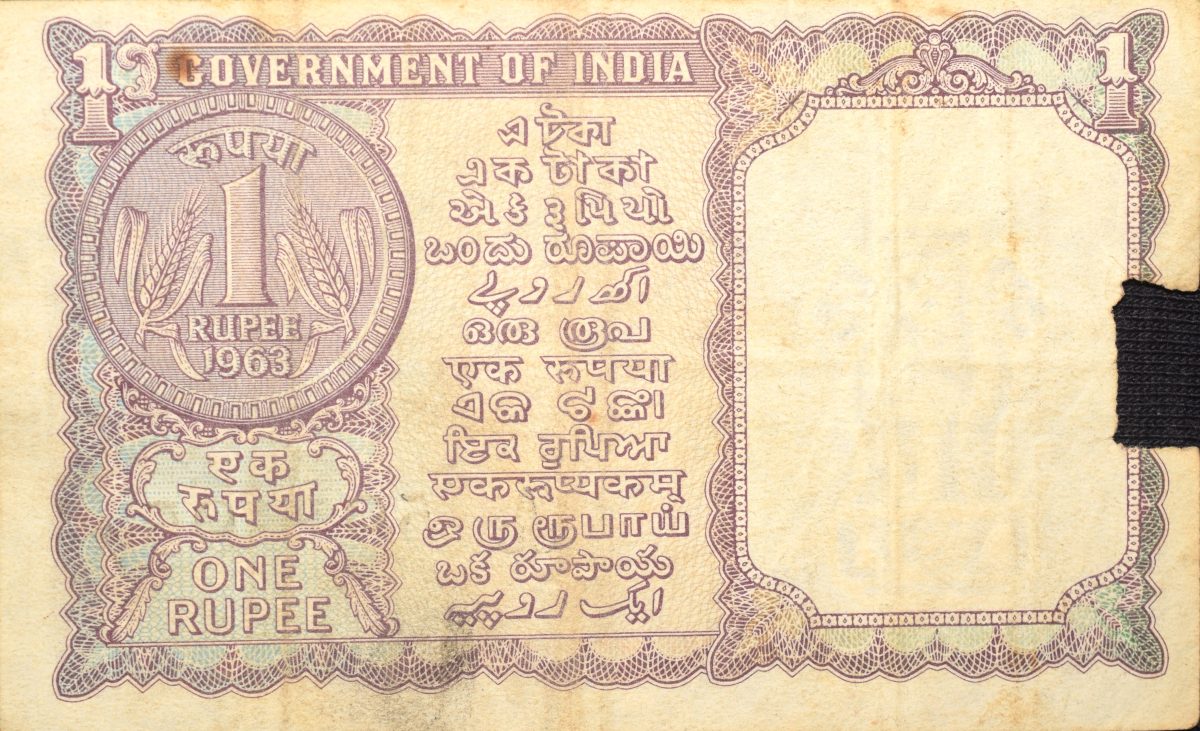 1 Rupee of Republic India (AD 1963) L.K. Jha – Violet color. Smaller watermark window and numbers to the left. Large ornamental 1 in the centre