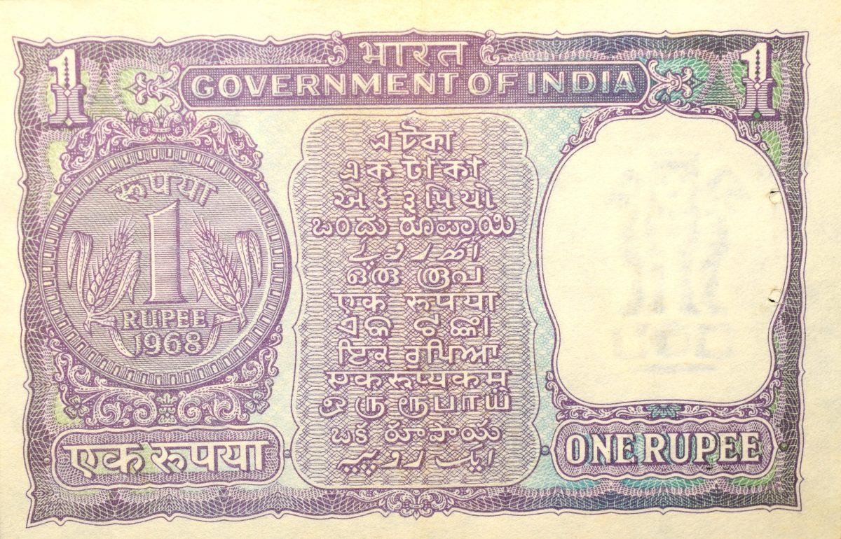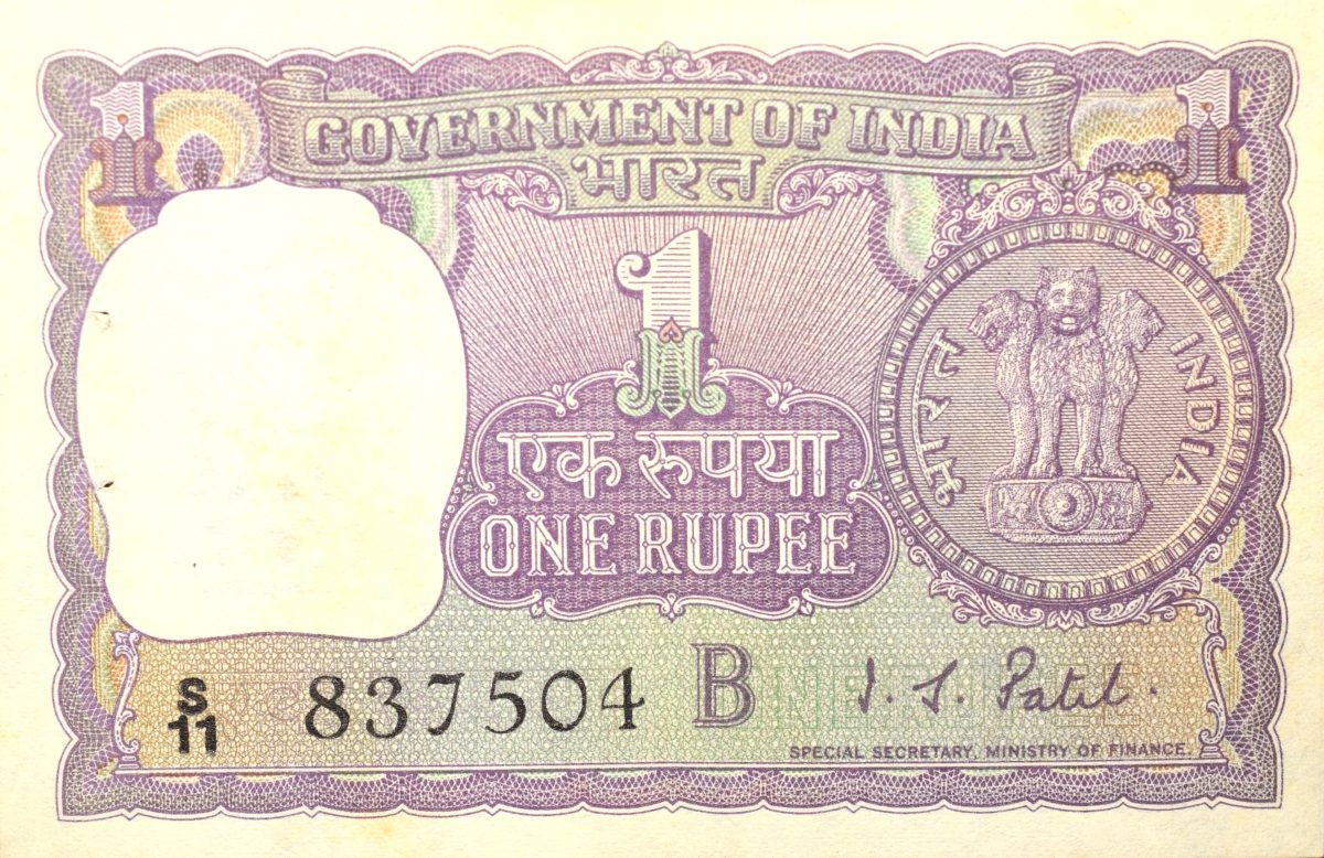 1 Rupee of Republic India (AD 1968) I.G. Patel – Violet color. Smaller watermark window and numbers to the left. Large ornamental 1 in the centre