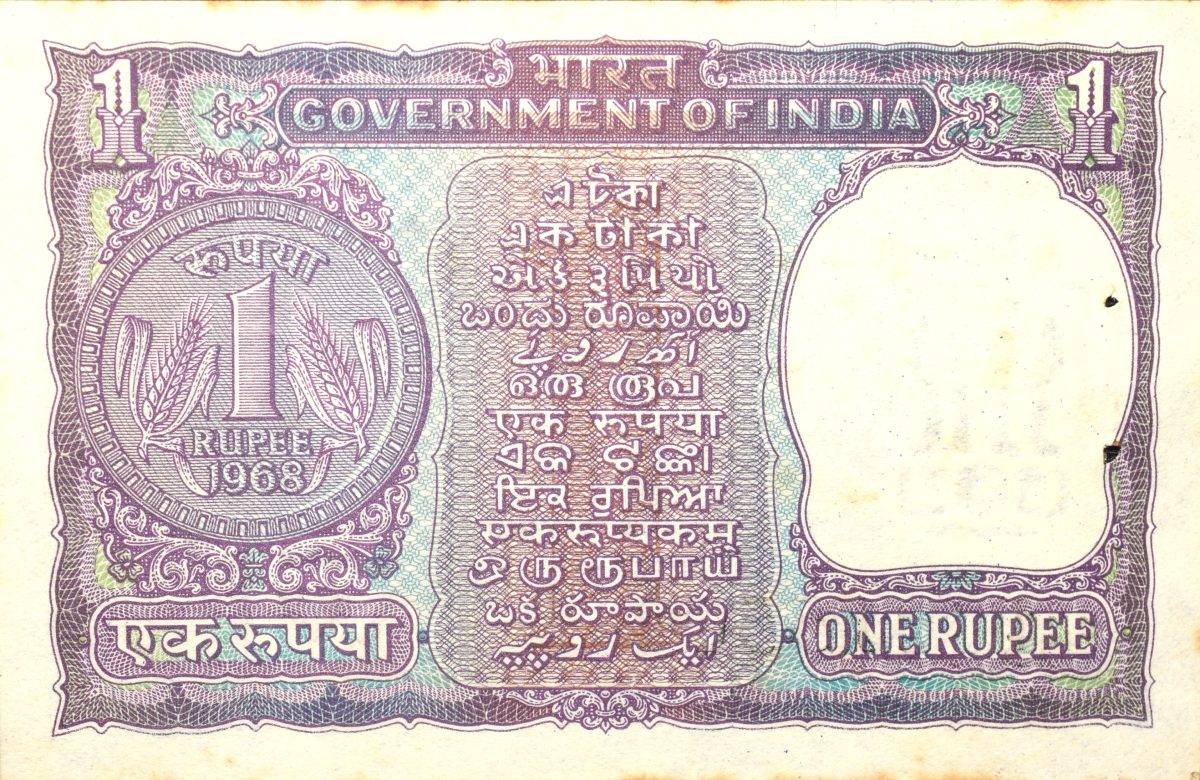 1 Rupee of Republic India (AD 1968) I.G. Patel – Violet color. Smaller watermark window and numbers to the left. Large ornamental 1 in the centre