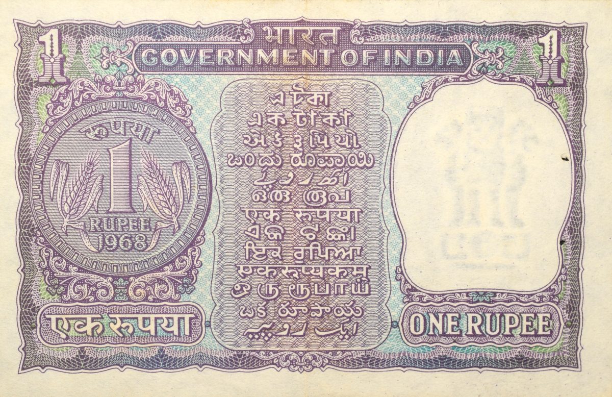 1 Rupee of Republic India (AD 1968) I.G. Patel – Violet color. Smaller watermark window and numbers to the left. Large ornamental 1 in the centre