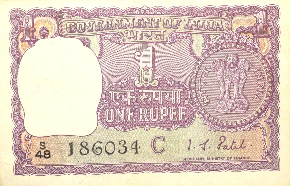 1 Rupee of Republic India (AD 1970) I.G. Patel – Violet color. Smaller watermark window and numbers to the left. Large ornamental 1 in the centre