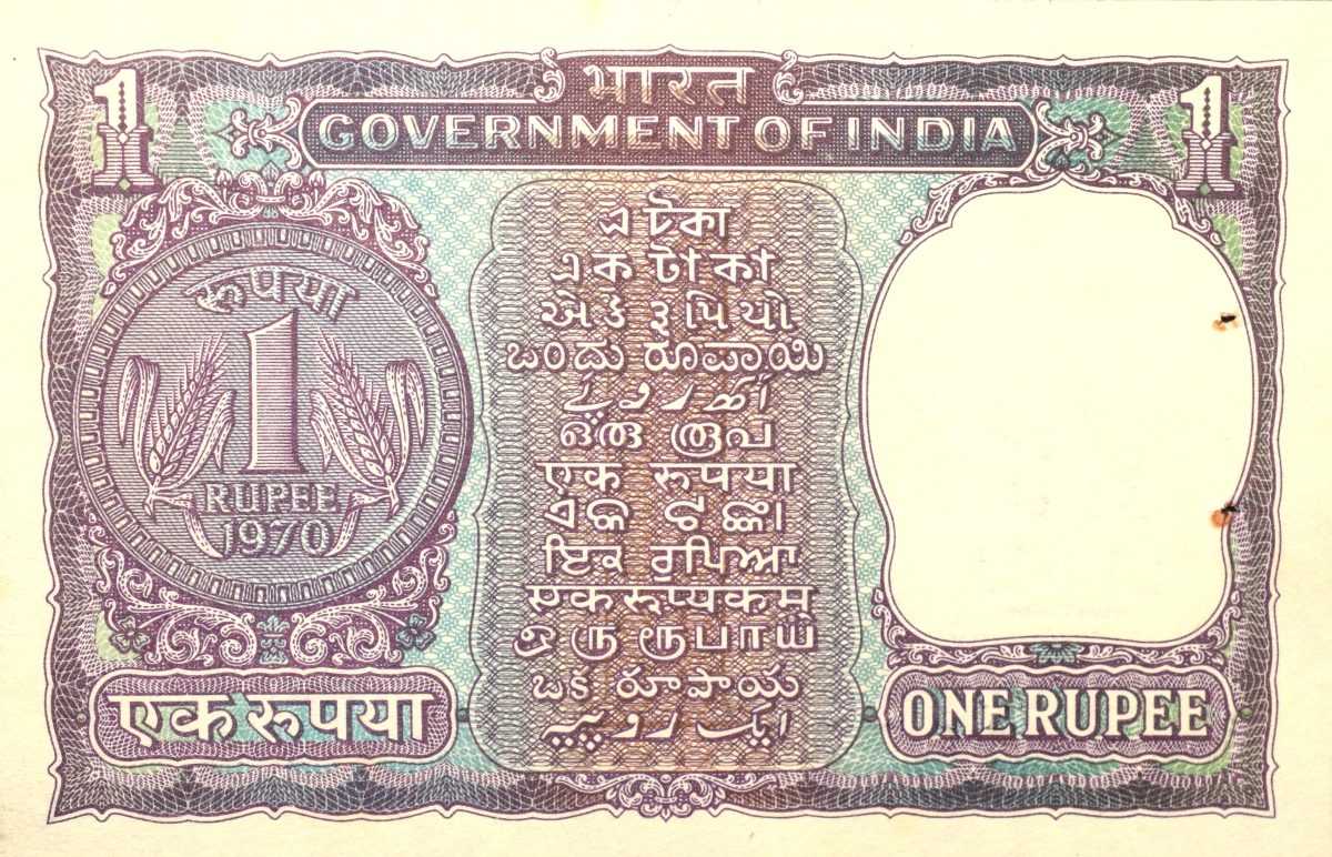 1 Rupee of Republic India (AD 1970) I.G. Patel – Violet color. Smaller watermark window and numbers to the left. Large ornamental 1 in the centre