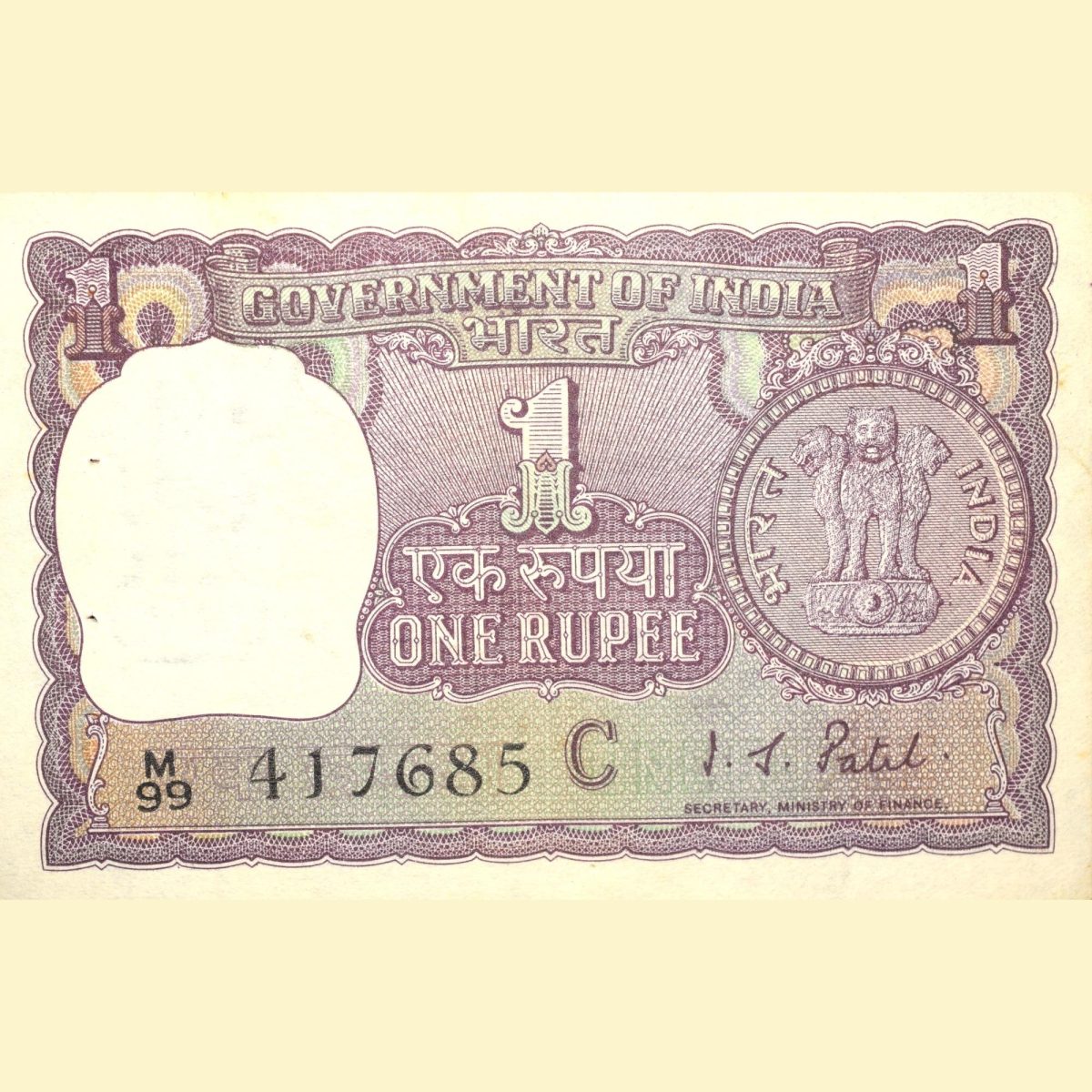 1 Rupee of Republic India (AD 1970) I.G. Patel – Violet color. Smaller watermark window and numbers to the left. Large ornamental 1 in the centre