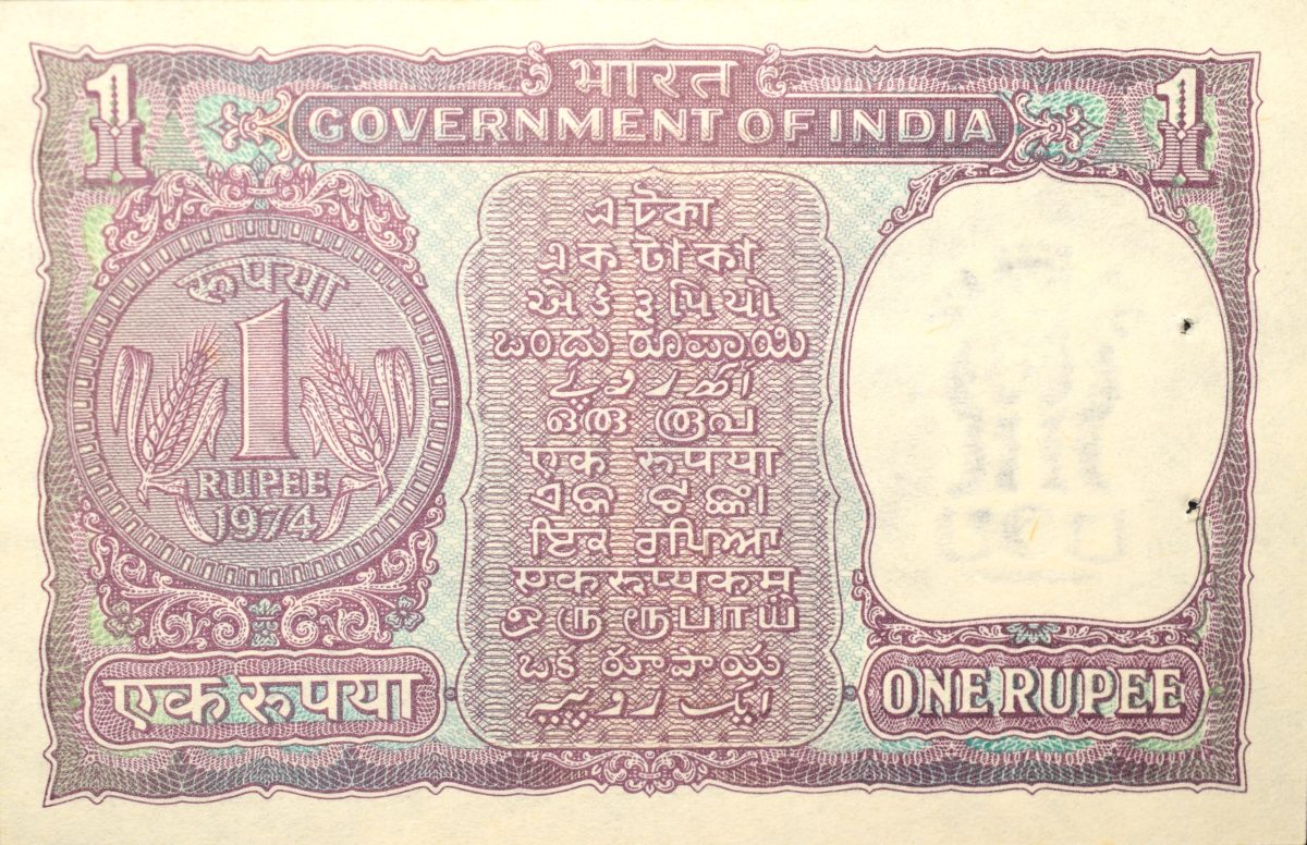 1 Rupee of Republic India (AD 1974) M.G. Kaul – Violet color. Smaller watermark window and numbers to the left. Large ornamental 1 in the centre