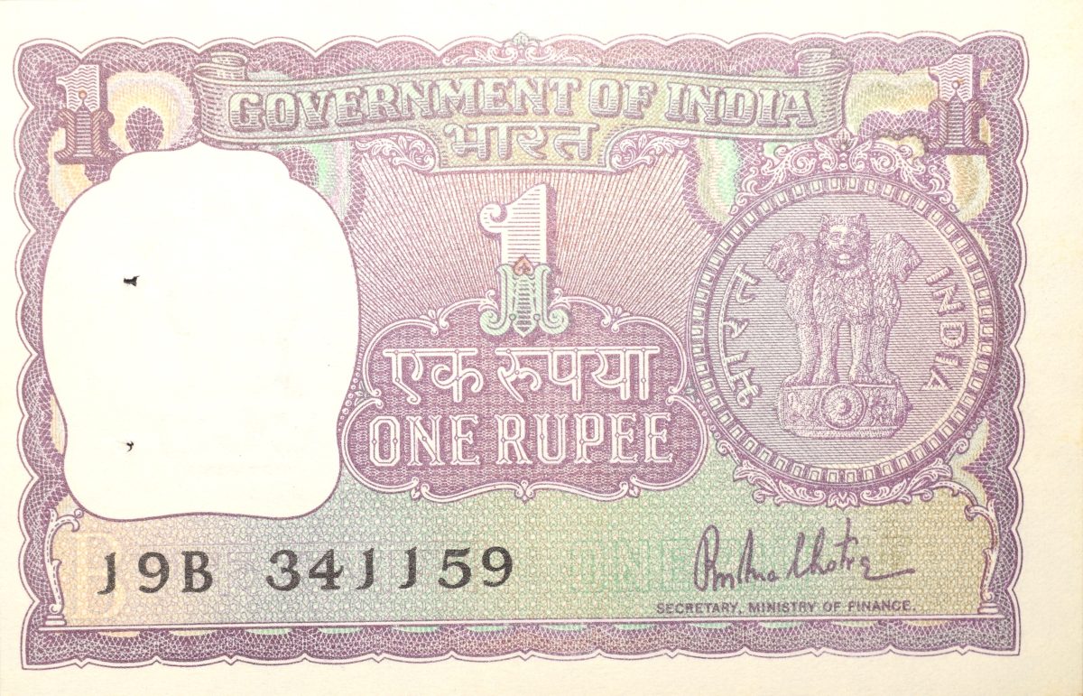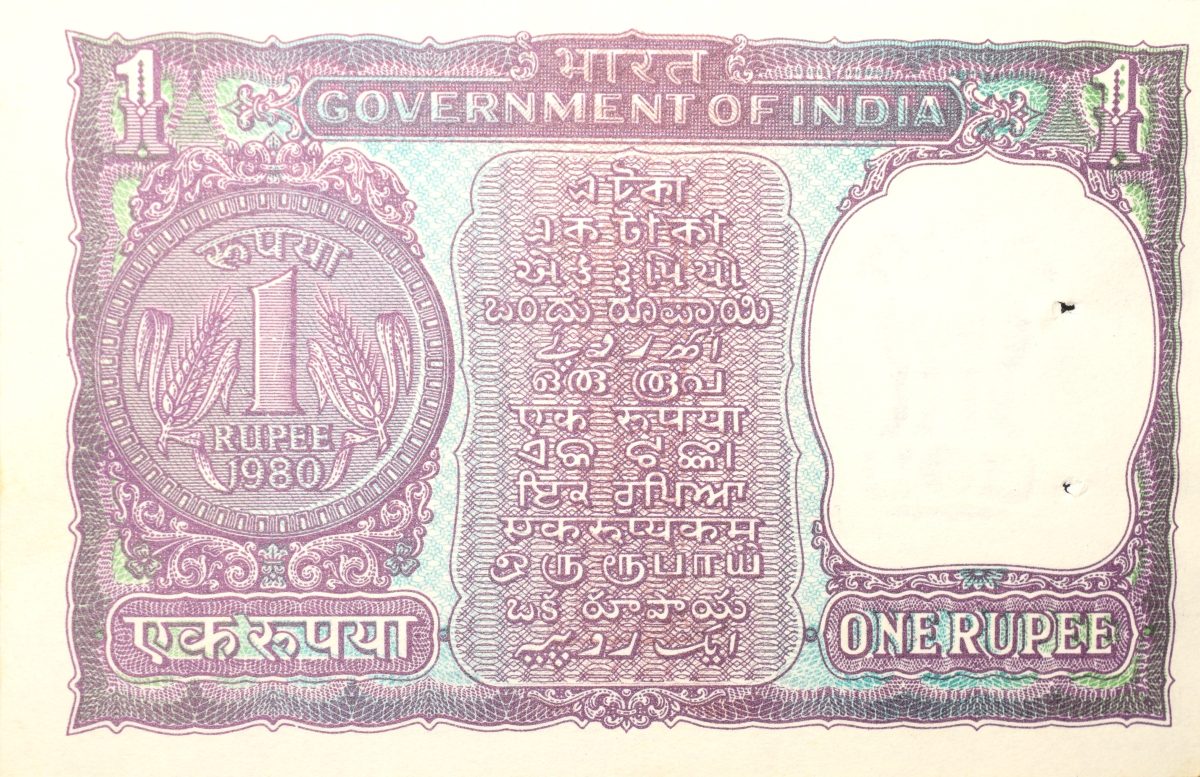 1 Rupee of Republic India (AD 1980) R.N. Malhotra – Violet color. Smaller watermark window and numbers to the left. Large ornamental 1 in the centre