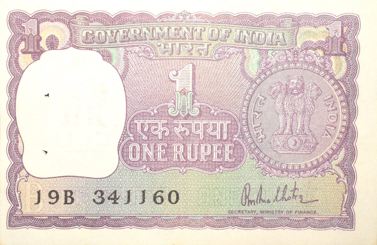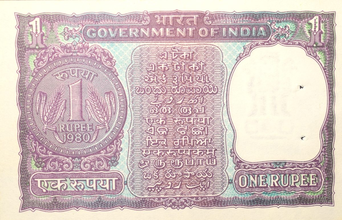1 Rupee of Republic India (AD 1980) R.N. Malhotra – Violet color. Smaller watermark window and numbers to the left. Large ornamental 1 in the centre