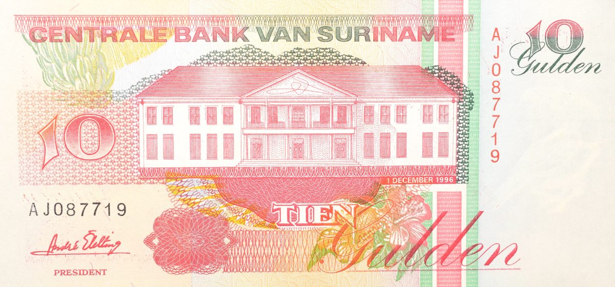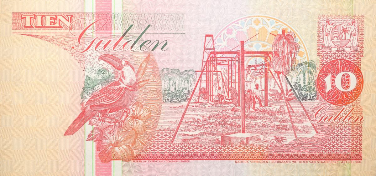 10 Gulden of Suriname Country (AD 1996) with Banana harvesting at center right & toucan at left