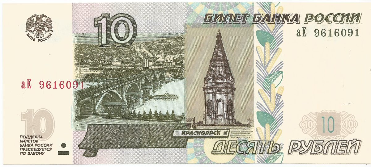 10 Roubles of Russia (AD 1997) with Hydroelectric dam in Krasnoyarsk