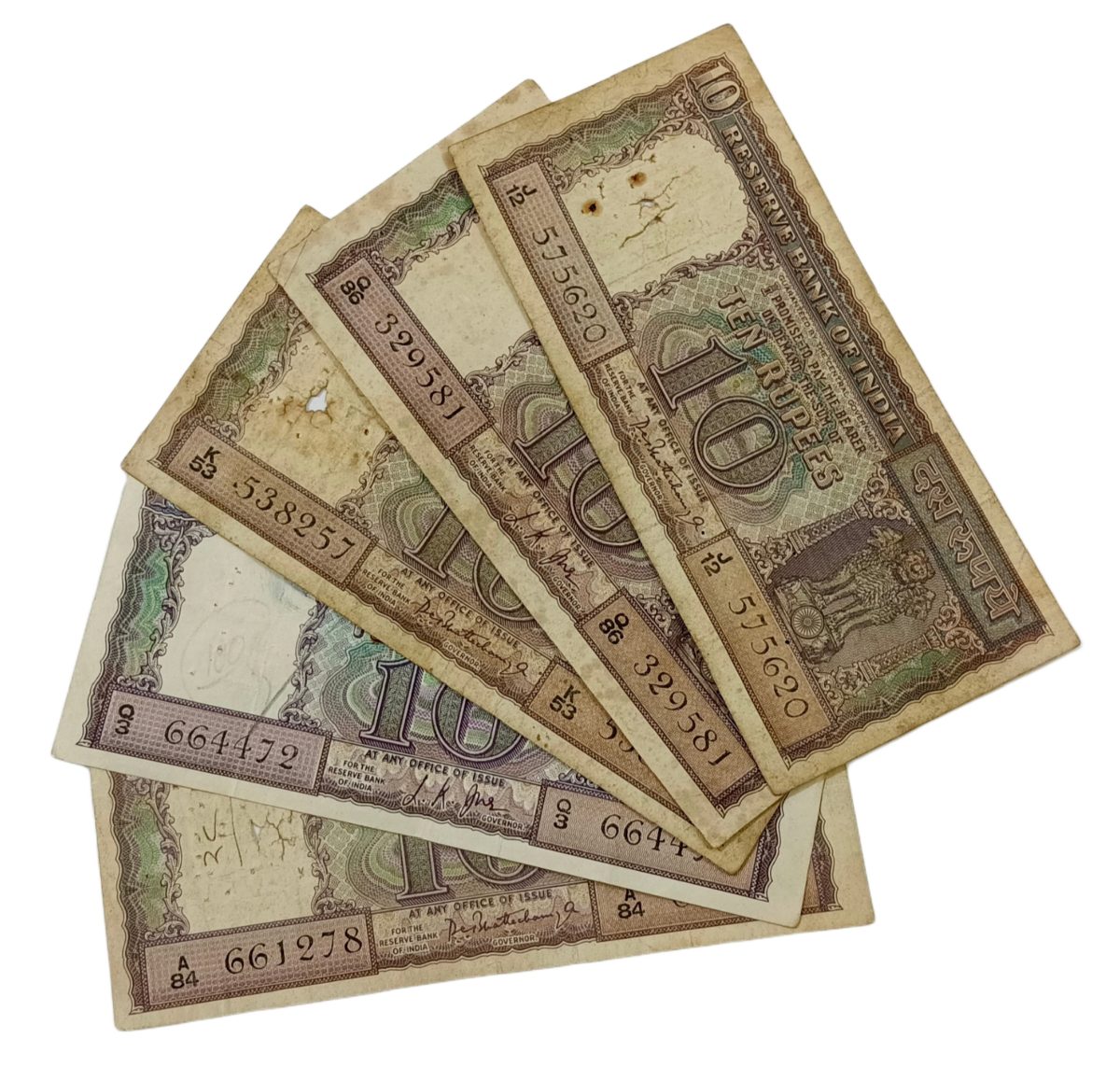 Each note in this lot is in Fine condition, bearing heavy usage marks that add to its authenticity and character. The scarcity of this collection makes it a prized possession for those passionate about numismatics and historical artifacts. The signatures of Bhattacharya and Jha further enhance the appeal of these banknotes.