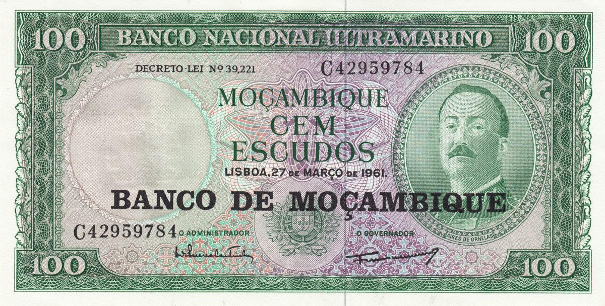 100 Escudos of Mozambique Country (AD 1975-1990) with A portrait of Aires de Ornelas. (Roman Catholic Archbishop of Goa)
