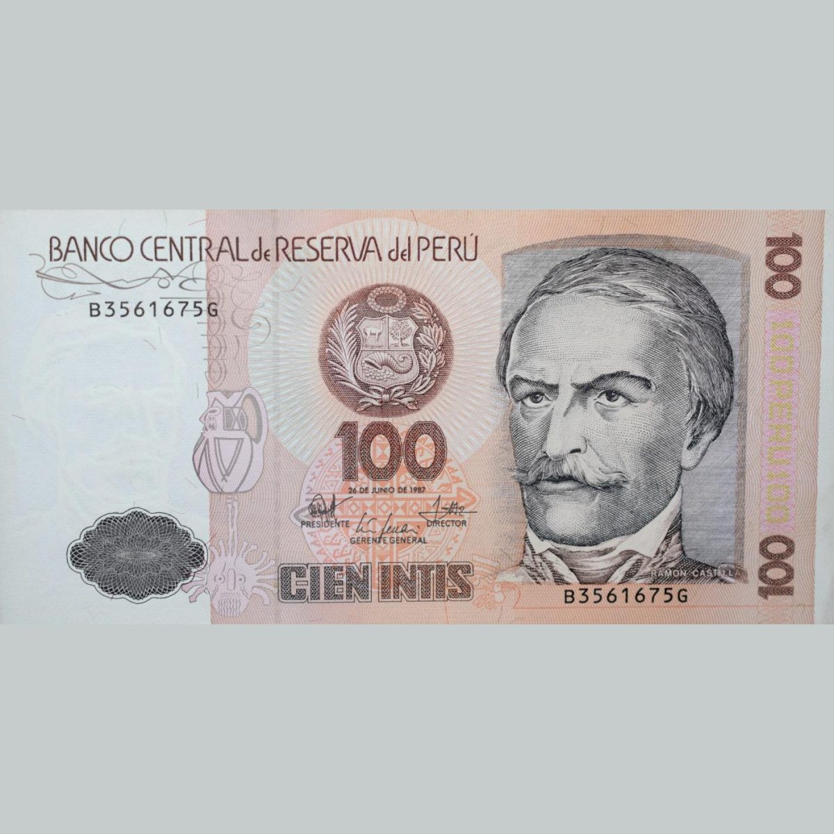 100 Intis of Peru Country (AD 1987) with woman at work at a ring spinning machine