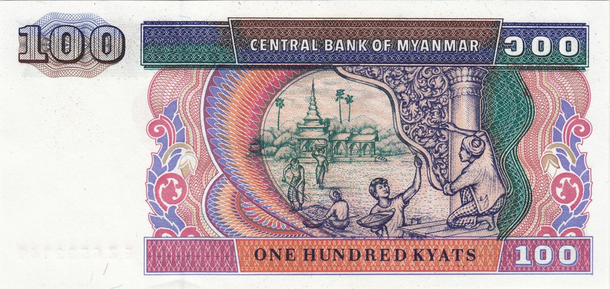 100 Kyat of Myanmar Country (AD 1994-1996) with Working on traditional decorative stucco