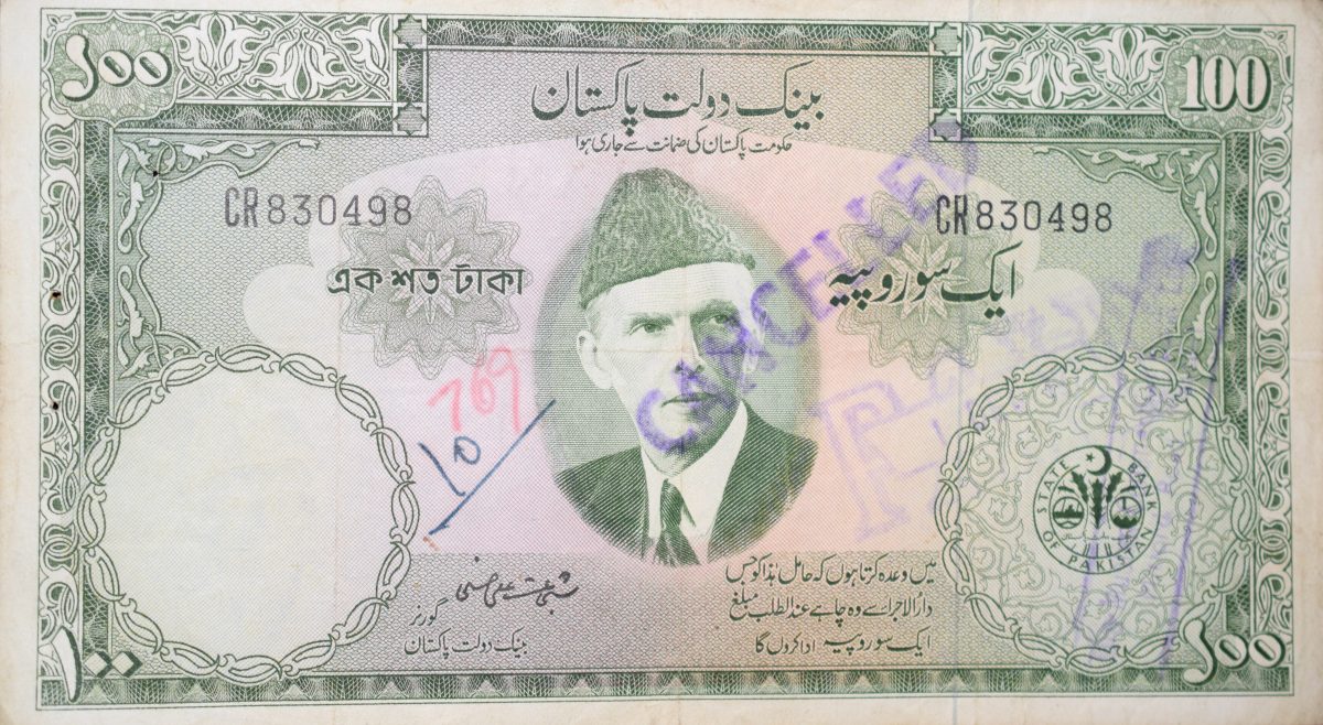 100 Rupees of East Pakistan (Now Bangladesh) with Portrait of Md. Ali Jinnah/The Badshahi Mosque