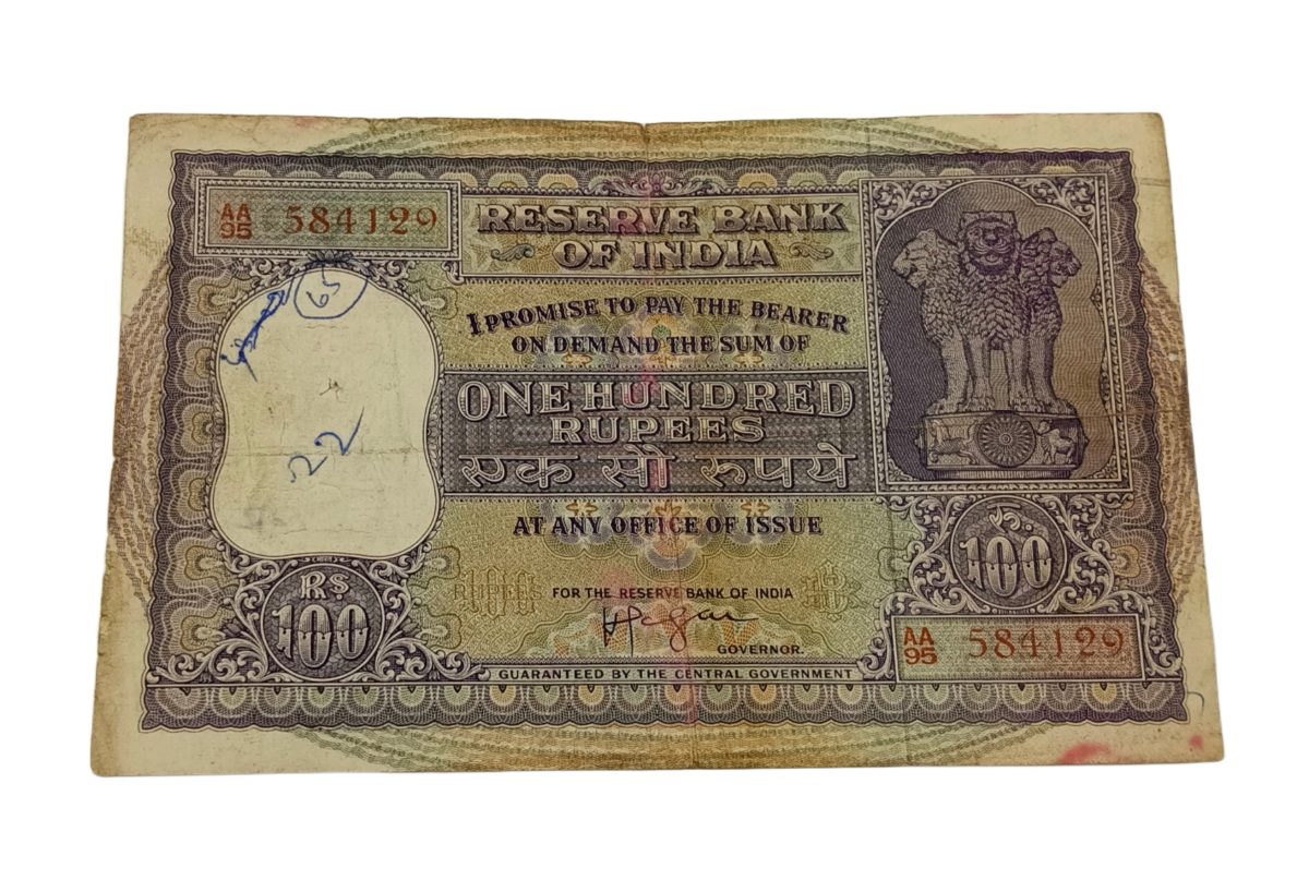 Step back in time with this rare and fascinating collectible – the 100 Rupees Old DAAM Big FAFRA Issue banknote bearing the unmistakable signature of H.V IYENGAR. Issued in a Fine (Heavy USED) condition, this banknote holds a special place in numismatic history. Originally minted in [year], this denomination represents a significant era in Indian currency. The unique attributes of this banknote include its rarity, distinctive signature, and historical significance.