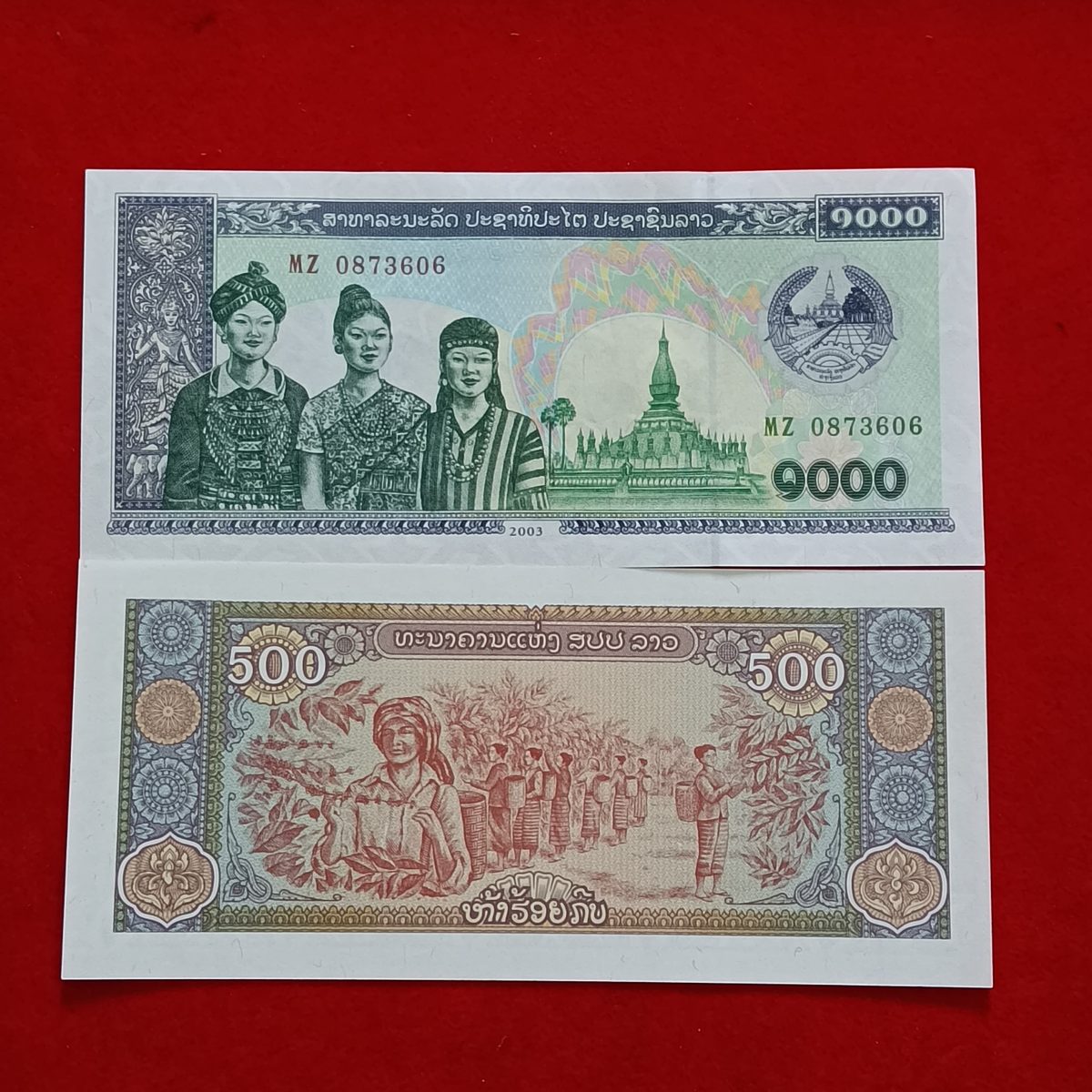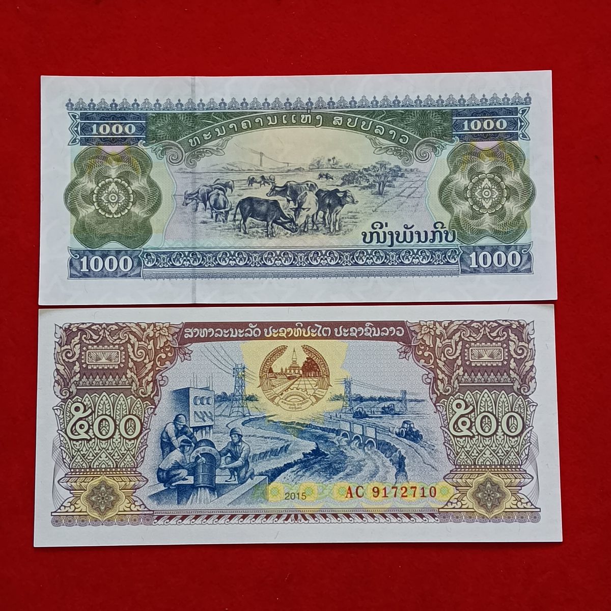 - 1000 Kip And 500 Kip of Laos Country Year 2003 or 2015 with cattle grazing UNC Grade Note 2 Pcs Set