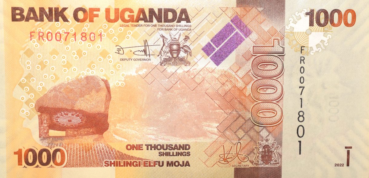 1000 Shillings of Uganda (AD 2022) with Antelope inside outline of country at center