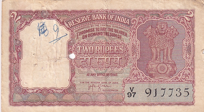 2 Rupees H.v.r Iyengar Signed “Half Tiger” Very Fine Note #1