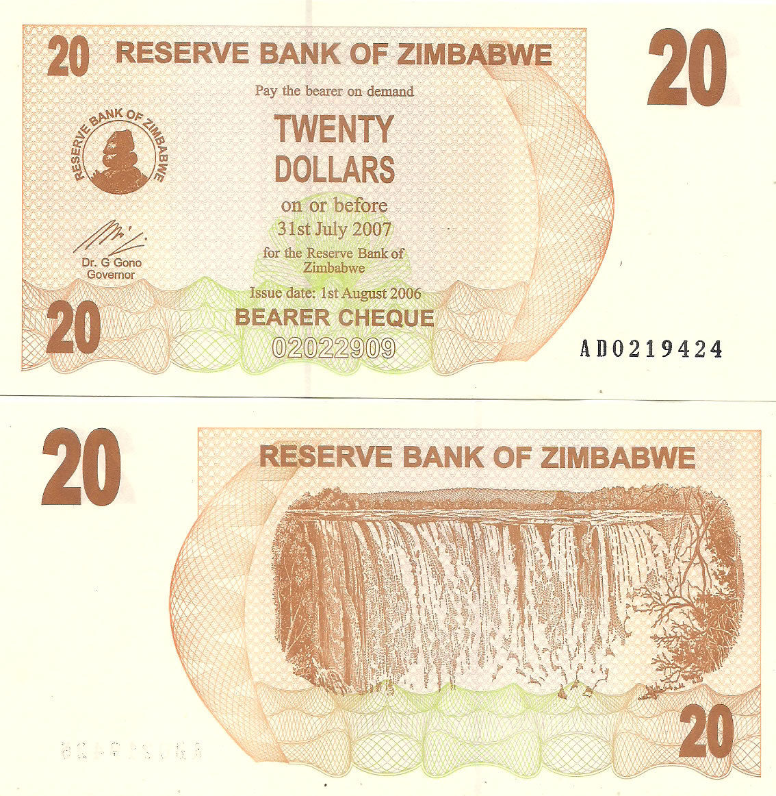 20 Dollars of Zimbabwe Country (AD 2006) with Victoria Falls on Zambezi River