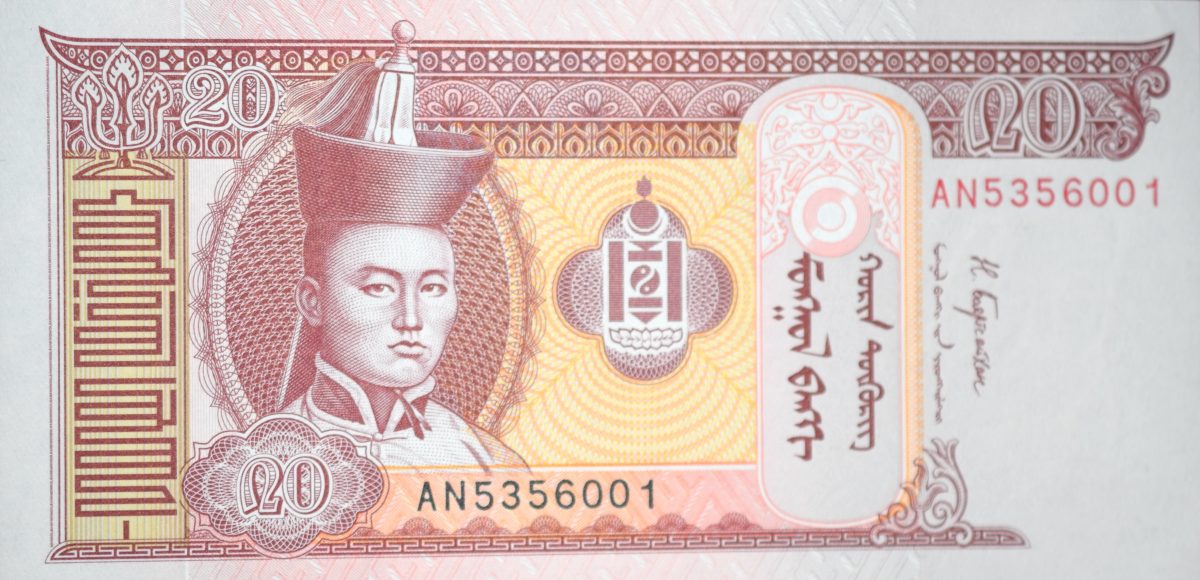 20 Togrog of Mongolia Country (AD 2018) with Mountain scenery with horses grazing in a valley