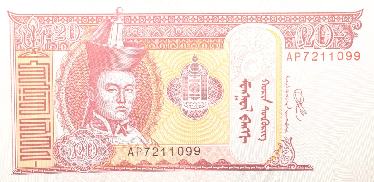 20 Togrog of Mongolia Country (AD 2020) with Mountain scenery with horses grazing in a valley