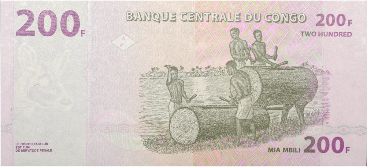 200 Francs of Congo Counry (AD 2022) with Telegraphic gong drummers
