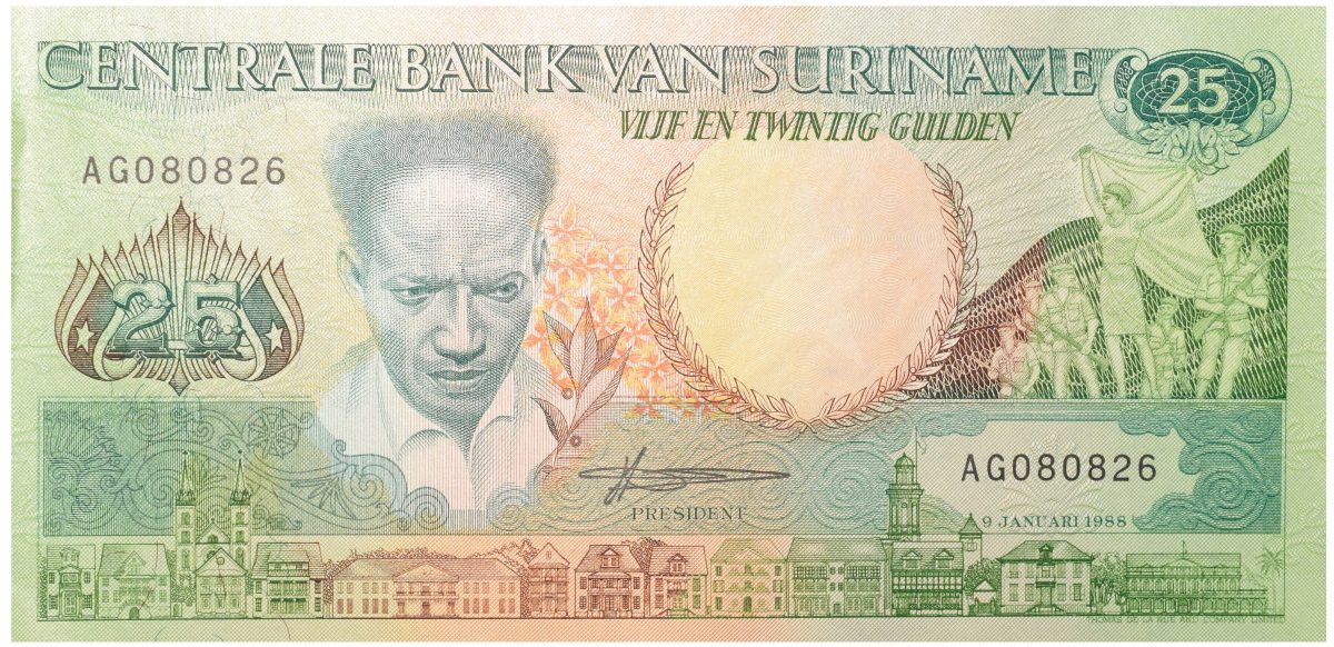 Suriname Country, (AD 1968-1988), 25 Gulden, Portrait of Anton DeKom, UNC Grade.