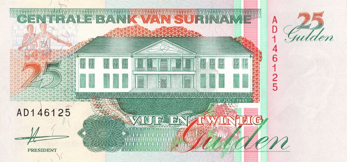 25 Gulden of Surname Country (AD 1991-1998) with Anthony Nesty, olympic gold medalist in the 100m butterfly event in Seoul 1988