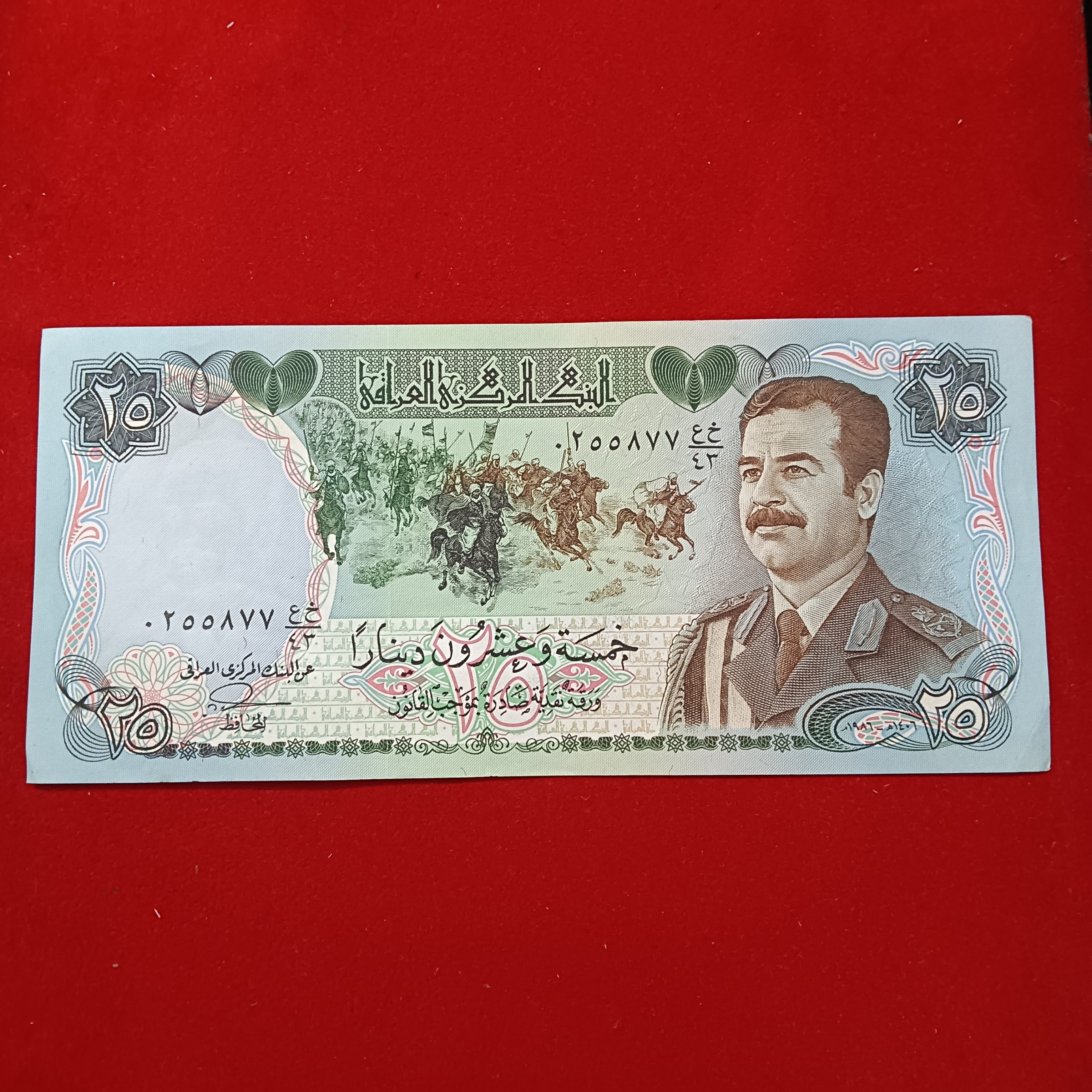 Iraqi 25 dinar banknote featuring the portrait of former Iraqi President Saddam Hussein.