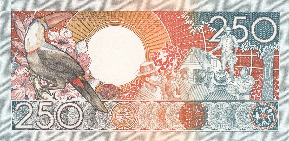 250 Gulden of Surname Country (AD 1991-1998) with Toucan bird