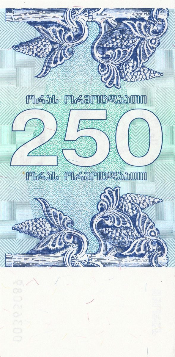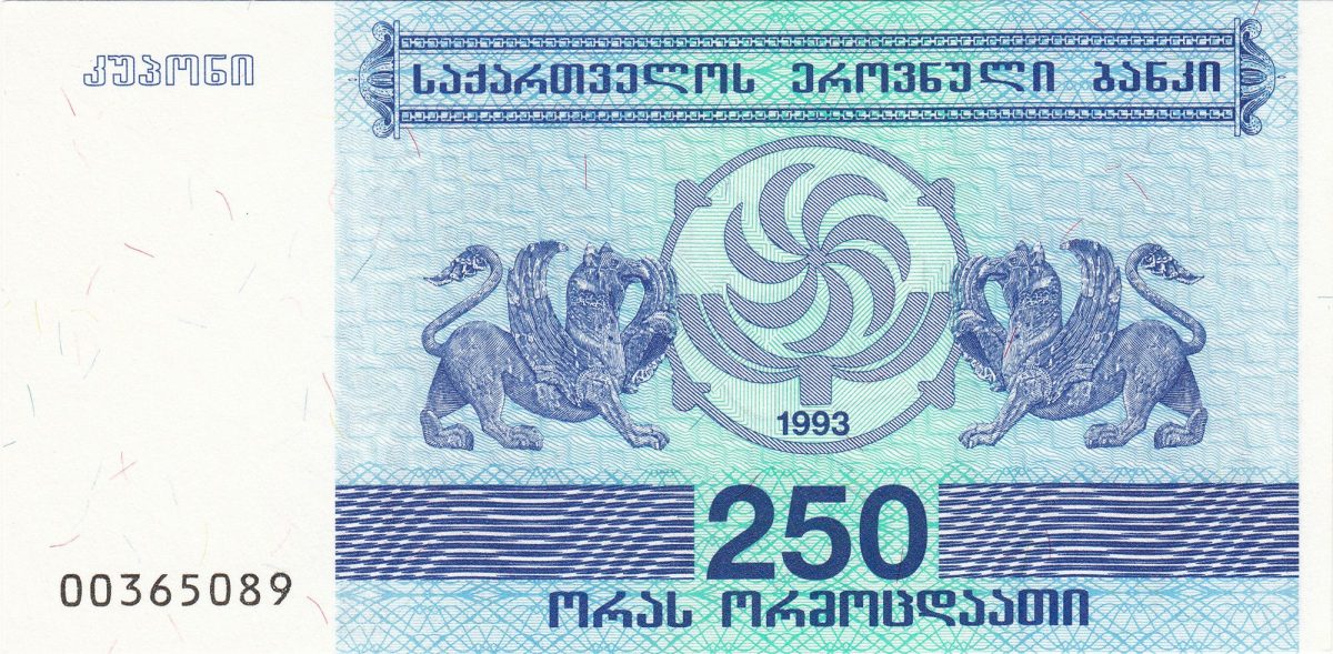 250 Kuponi of Georgia Country (AD 1993) with Griffins at left and right of Borjgali/two bunches of grapes