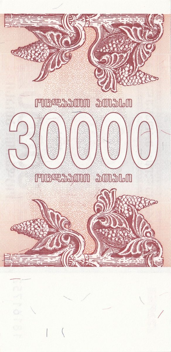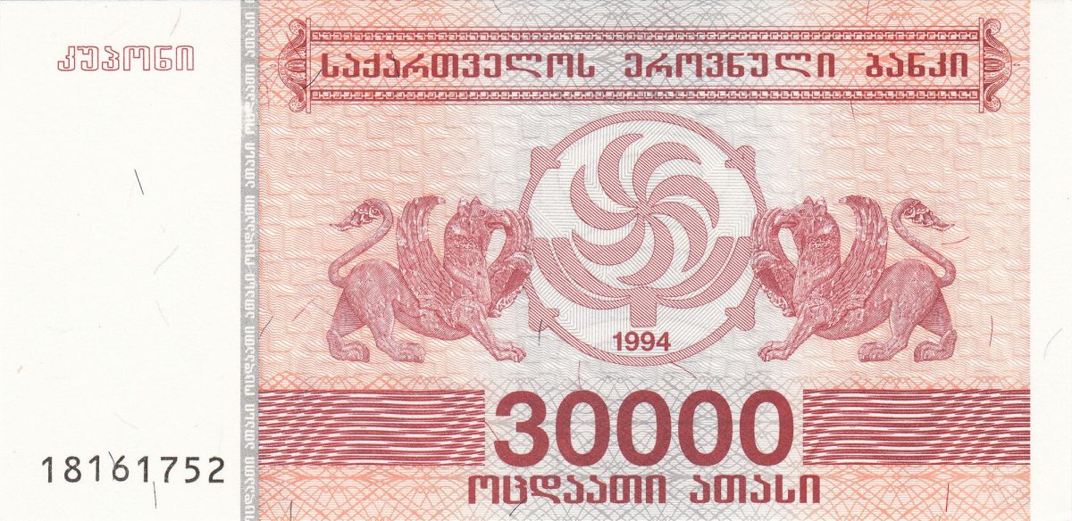 30000 Kuponi of Georgia Country (AD 1994) with Griffins at left and right of Borjgali/two bunches of grapes