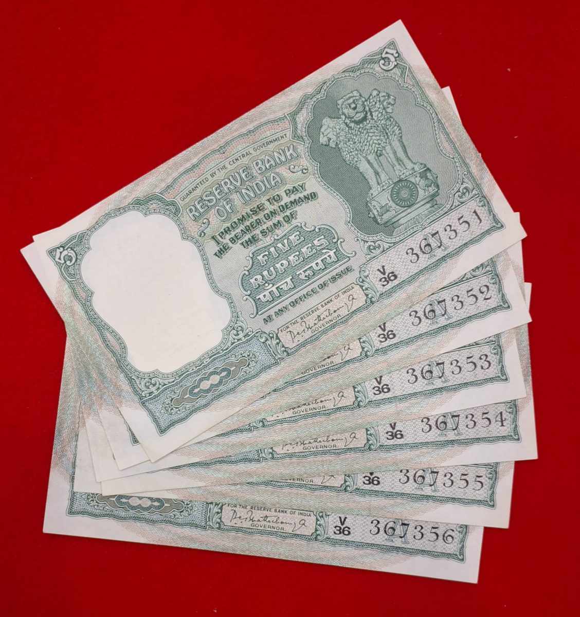 5 rupee note C-6 P.C. Bhattacharya released 6th February 1964 Gem UNC Condition each note price 1575