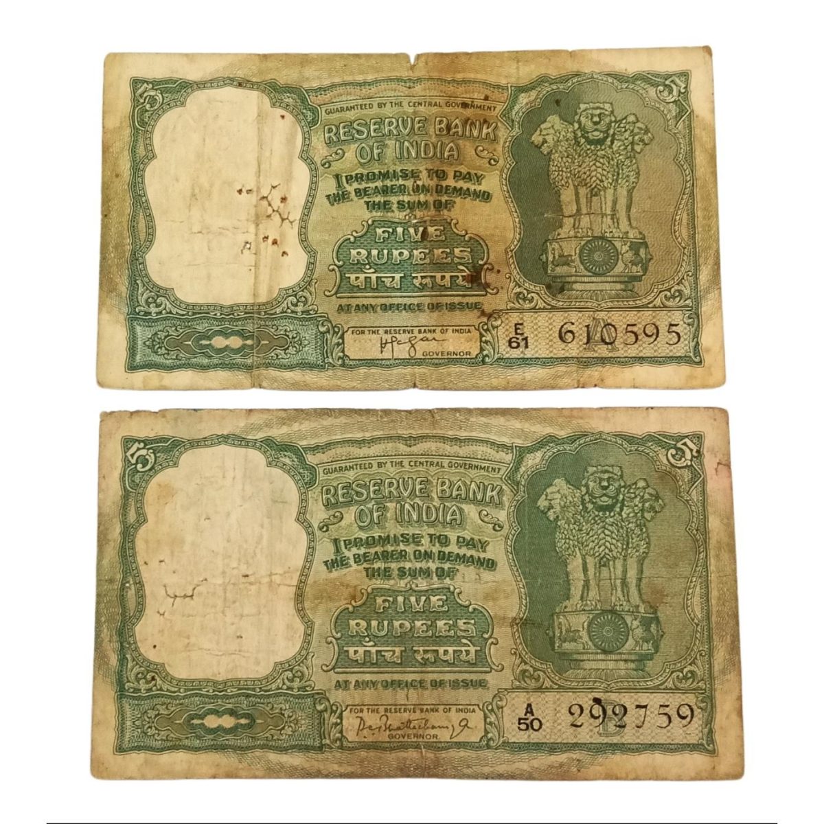5 Rupees Big FAFRA Issue H.V IYENGAR and P.C BHATTACHARYA 2 Notes are in Used Conditions.