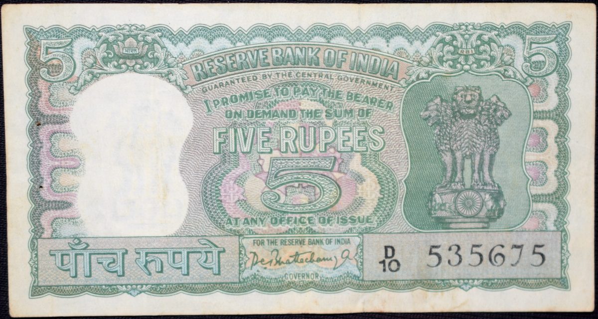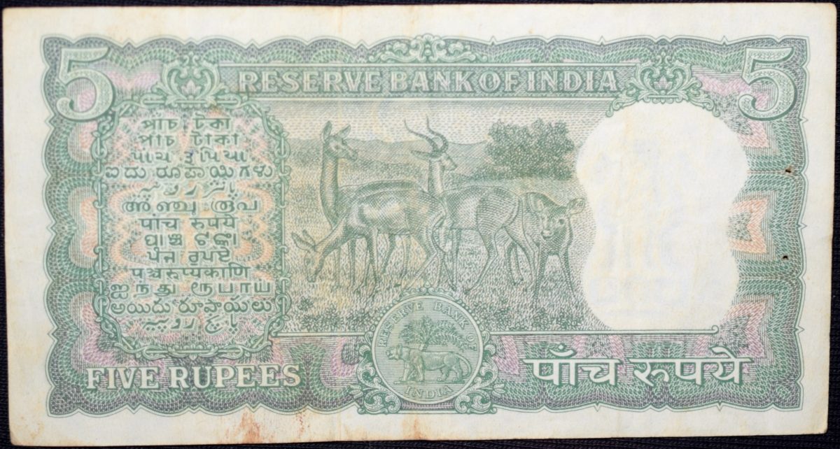 5 Rupees of Republic India (AD 1962-1967) with Antelope at center – P.C.Bhattacharya
