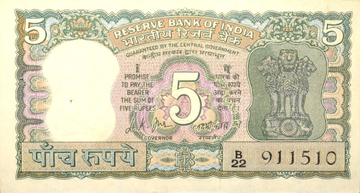 5 Rupees of Republic India (AD 1969-1970) 100th birth anniversary of Mohandas Karamchand Gandhi – L.