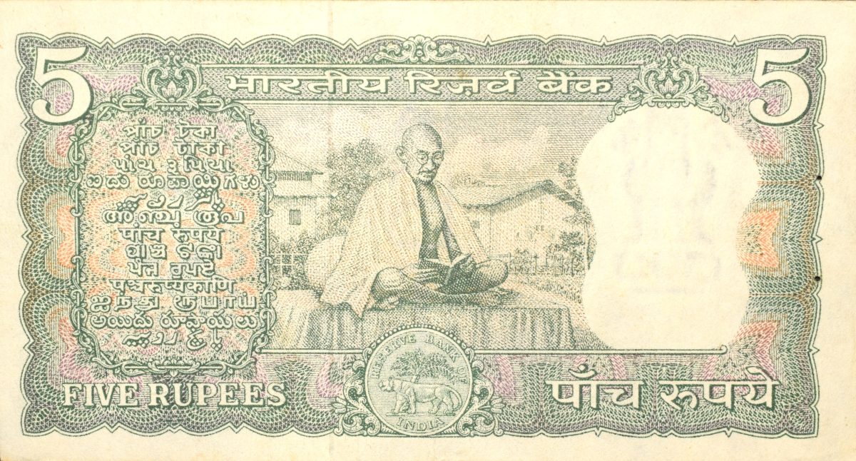 5 Rupees of Republic India (AD 1969-1970) 100th birth anniversary of Mohandas Karamchand Gandhi – L.K. Jha Signature