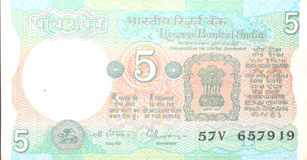 5 Rupees of Republic India (AD 1987-1997) with Farmer ploughing with a tractor while sun is rising – C. Rangarajan Signature