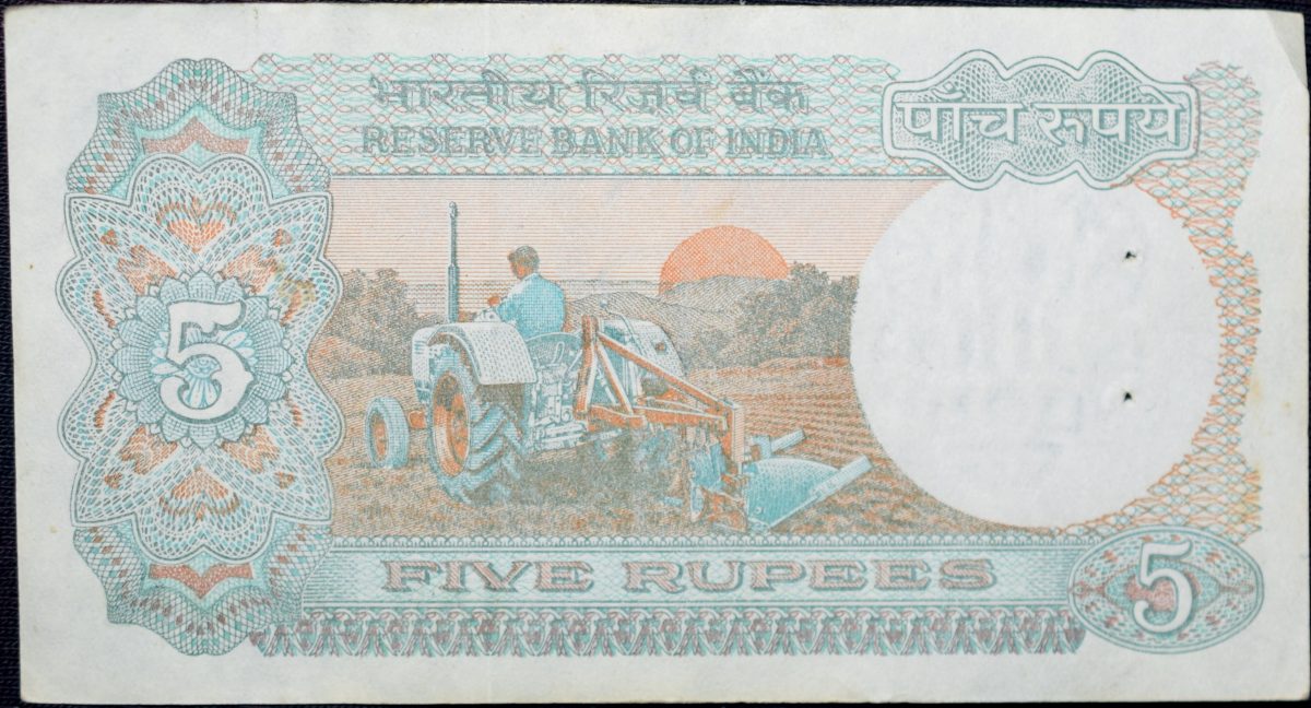 5 Rupees of Republic India (AD 1987-1997) with Farmer ploughing with a tractor while sun is rising – C. Rangarajan Signature