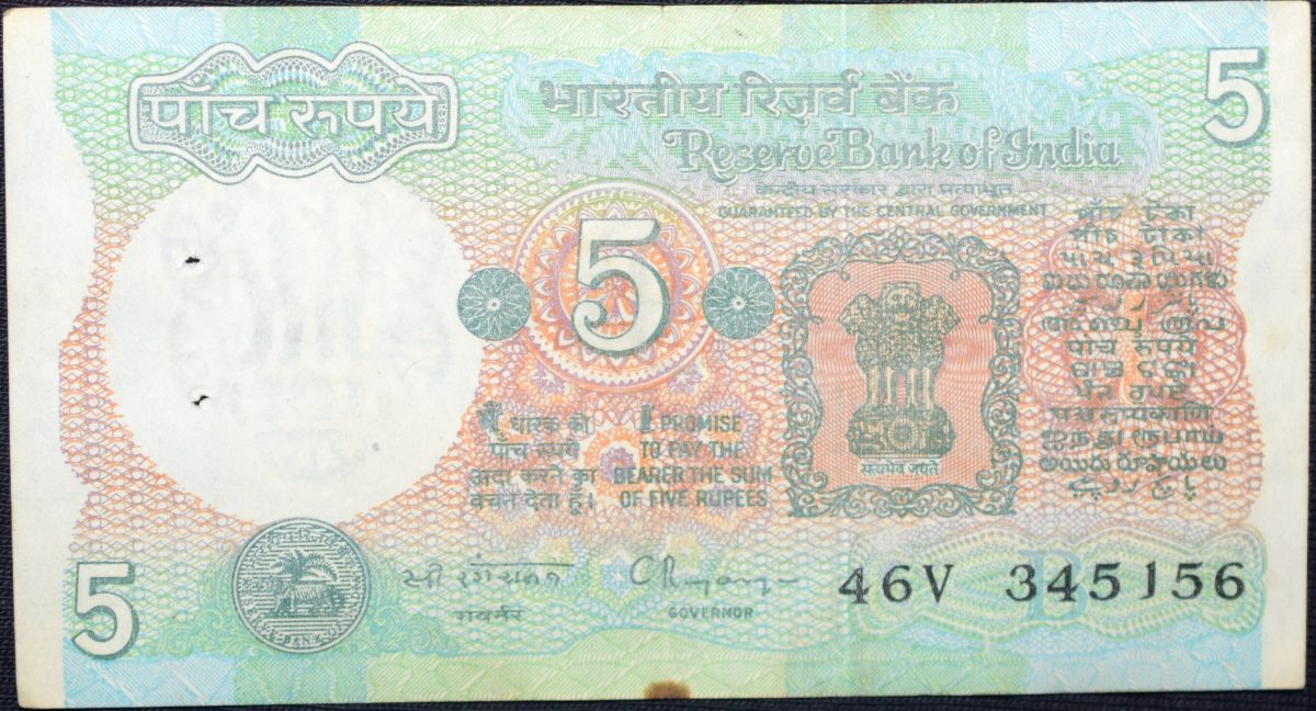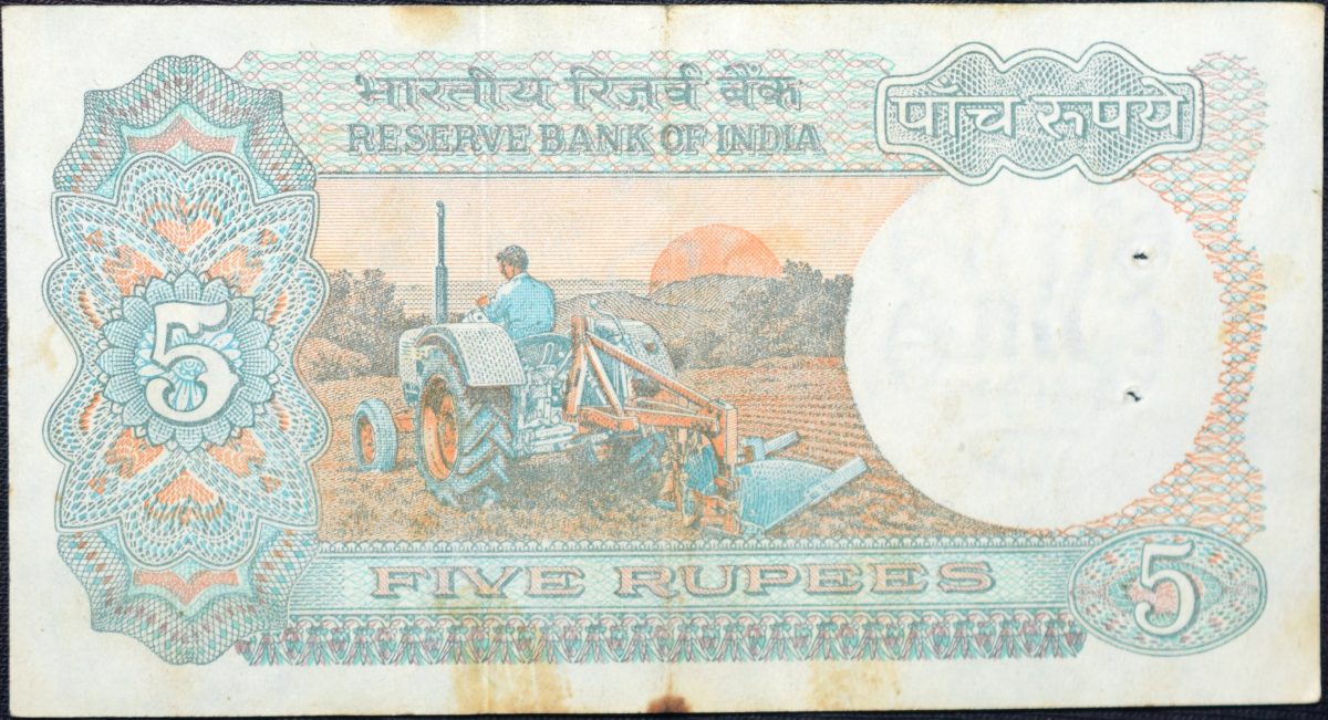 5 Rupees of Republic India (AD 1987-1997) with Farmer ploughing with a tractor while sun is rising – C. Rangarajan Signature