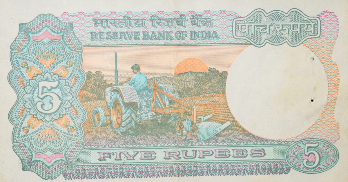 5 Rupees of Republic India (AD 2002-2003) with Farmer ploughing with a tractor while sun is rising – Bimal Jalan