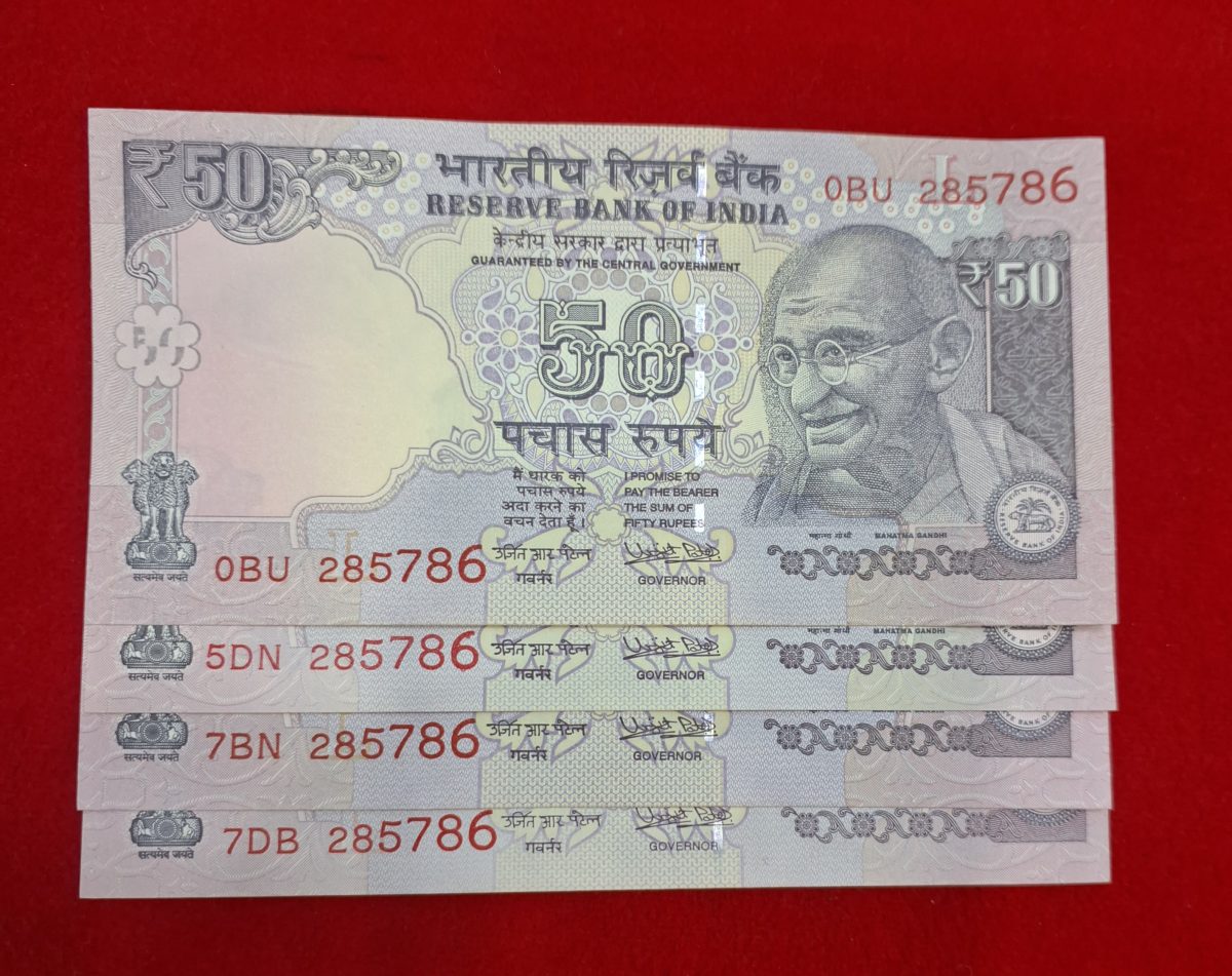50 RUPEE GEM UNC CONDITION 4 NOTES ENFING 786SAME SERIAL NO. 285786