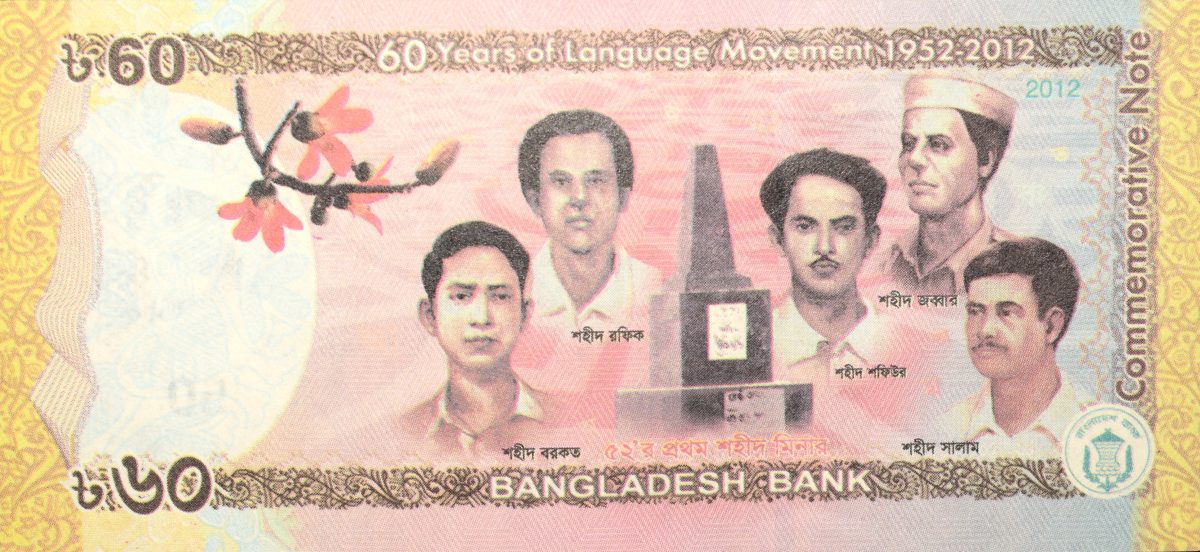 60 Taka of Bangladesh (AD 2012) Commemorative issue – 60 Years of Language Movement 1952-2012 UNC Grade