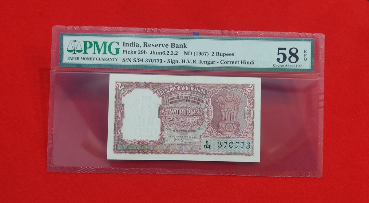 The B-4 H. V. R. Iyengar PMG Graded 58 banknote, with the unique serial number 370773, is a rare and highly sought-after collectible released on 22nd July 1957. This meticulously graded banknote holds historical significance as it was issued by the renowned H. V. R. Iyengar, making it a valuable piece of numismatic history. The note’s exceptional grade, coupled with its distinct serial number, adds to its desirability among collectors and enthusiasts alike. Featuring intricate design elements and bearing the signatures of prominent officials, this banknote encapsulates a bygone era of currency circulation.