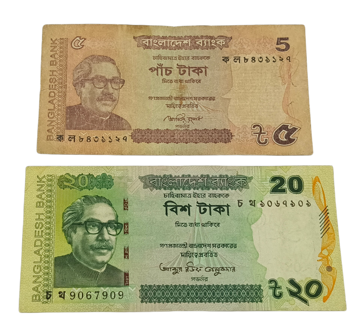 BANGLADESH 5 TAKA and 20 TAKA Set 2 Notes are in Collectable Grades.