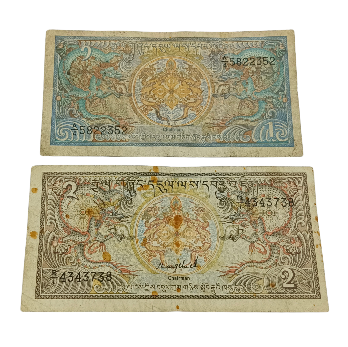 BHUTAN Old Series 1 NGULTRUM and 2 NGULTRUM Set 2 Notes **SCARE** Collectable Grades.